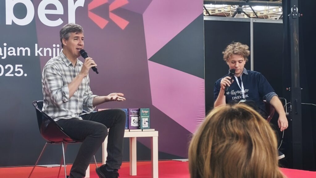 U srijedu, 12. studenoga 2025., učenici Mali knjižničari četvrtog razreda i Literarne skupine OŠ „Stjepan Radić“ iz Božjakovina posjetili su sajam knjiga Interliber. Uz miris tisuća knjiga i uzbuđenje koje se osjećalo u zraku, učenike je dočekao poseban doživljaj – književni susret s autorom popularnog serijala Gregov dnevnik, Jeffom Kinneyjem.