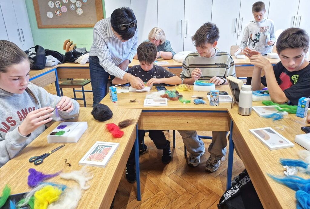 Na početku su učenici saznali što je filcanje vune, koje se vrste tehnika koriste (mokro i suho filcanje) te kako se prirodna vuna pretvara u razne oblike i predmete. Poseban naglasak bio je na suhom filcanju koje se izvodi pomoću posebne igle. Učenici su naučili kako pravilno i sigurno rukovati iglom te kako postupnim ubodima oblikovati vunu u željeni oblik. Uz vodstvo učiteljice i demonstraciju korak po korak, učenici su na podlozi od filca „slikali vunom”. Tijekom rada su pokazali veliku upornost, preciznost i maštovitost.