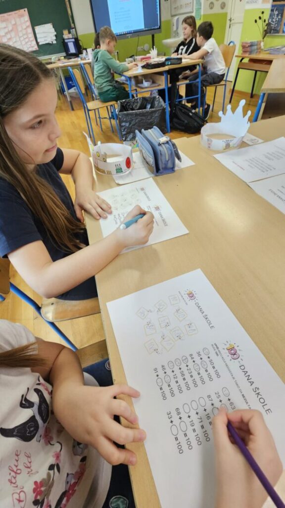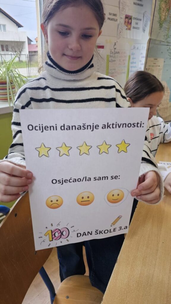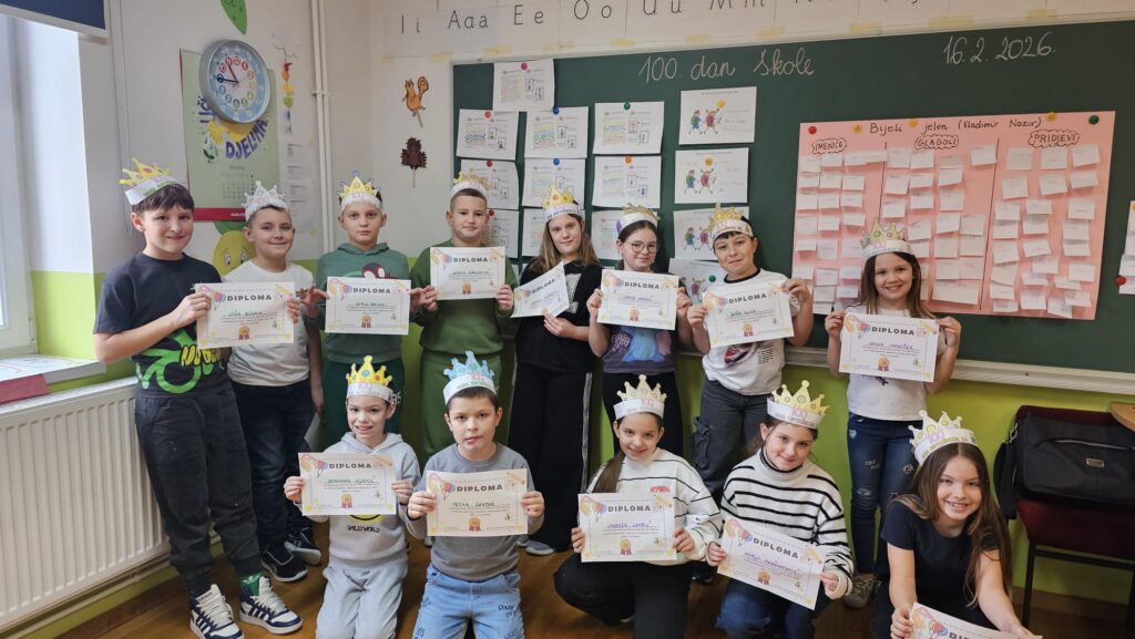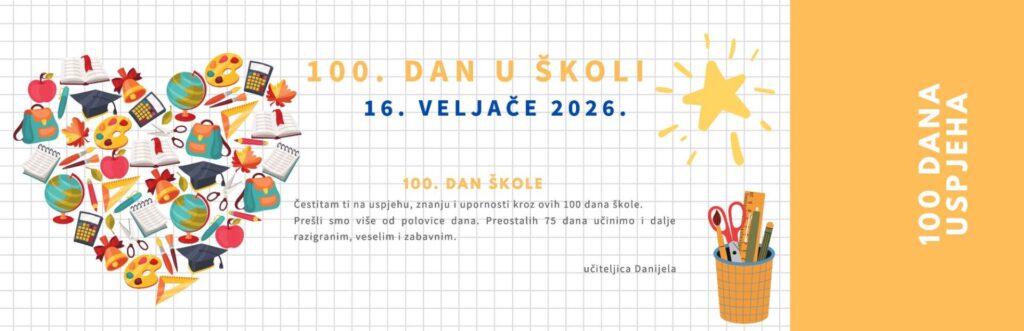 Likovna kultura realizirana je kroz aktivnost crtanja sebe kao stogodišnjaka, a učenici su izrađivali i šarene krune koje su ponosno nosili. Stotinu vježbi za razgibavanje i oblikovanje učenici  su izveli uz čarobni kotač Wordwall digitalne igre. Dan je bio ispunjen malim izazovima i velikim uspjesima. Na Satu razrednika  prisjetili smo se i onih 100 puta koliko je učiteljica tijekom godine ponovila važne poruke kao i smiješnih i zabavnih trenutaka koje smo zajedno doživjeli ove nastavne godine. Zajedno smo se prisjetili i 100 stvari koje su učenici ove godine i naučili. Za najslađi trenutak pobrinulo se 100 bombona, kojima su učenici zasladili svoj dan. Na kraju dana učenici su ispunili evaluaciju te dan ocijenili zabavnim, zanimljivim i prepunim pozitivne energije. Svečane diplome učenicima su dodijeljene za 100 dana marljivosti, rada i truda u školi.